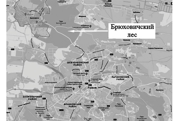 Карта Львова с указанием месторасположения т.н. «Брюховичского леса». На момент описываемых событий эта зелёная зона уже более двух десятилетий входила в административную границу областного центра и считать её настоящим диким лесом вряд ли можно – там было много дорожек, тропинок, гуляли люди, летом там открывался пионерский лагерь, в общем – это скорее парковая зона.