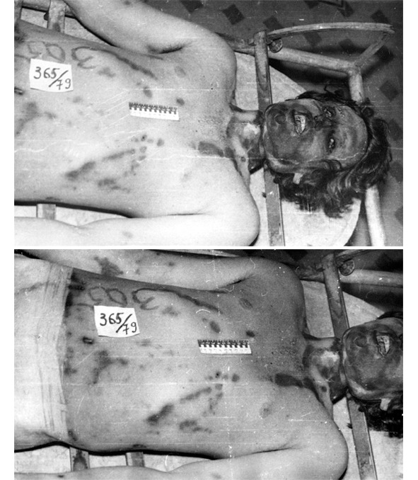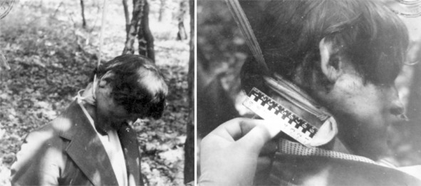 В уголовном деле имеется 13 фотографий, сделанных во время производства вскрытия тела Владимира Ивасюка. Нам не обойтись без того, чтобы воспроизвести некоторые из них. Сделать это совершенно необходимо, дабы читатели получили возможность самостоятельно составить представление о том, как в действительности выглядело тело и насколько обоснованны утверждения о следах пыток, якобы имевшихся на нём. Необычный тёмно-бурый цвет лица и части шеи выше странгуляционного следа появился вследствие цианоза крови в области верхней полой вены – это первый и наиболее очевидный внешний признак смерти от механической асфиксии.