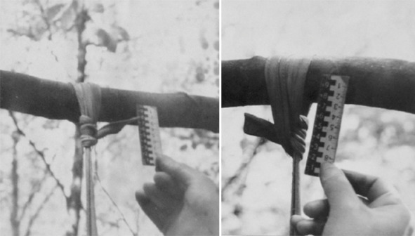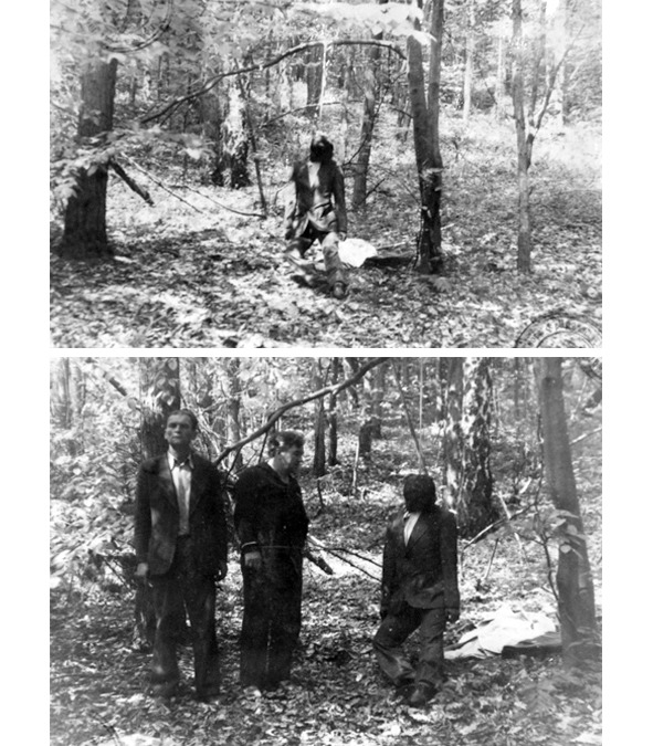 Фотографии узла на ветке дерева. Левая фотография сделана неправильно – луч зрения фотографа направлен снизу вверх, что искажает восприятие мерной линейки, приложенной к узлу. Фотограф исправился и второй снимок сделал правильно – перпендикулярно линейке. Интересная деталь – в деле сохранены обе фотографии, хотя ту, что слева, вполне можно было не печатать и не приобщать. Однако её напечатали и вклеили. По мнению автора, существует единственное объяснение почему это было сделано: следователь Рябушко с самого начала понимал, что расследование войдёт в историю, а потому решил не отбрасывать свидетельства, которые возможно представят интерес в будущем.