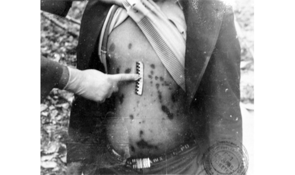 Этот фотоснимок демонстрирует состояние кожных покровов на груди и животе трупа. «Синяки» вовсе не являются прижизненными кровоподтёками, как быть может, кто-то подумал – это следствие посмертной имбибиции – проникновения клеток крови через стенки сосудов и пропитывания прилегающих тканей. Можно видеть, что цепочки пятен тянутся сверху вниз по ходу кровеносных сосудов. В отличие от процесса образования трупных пятен, возникающих спустя считанные часы с момента наступления смерти, имбибиция развивается довольно медленно, её обнаружение в подобном виде свидетельствует о давности смерти 2 недели и более (разумеется, с той оговоркой, что на степень её выраженности влияют условия хранения трупа).