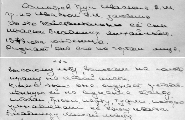 Фрагменты протокола опознания трупа от 19 мая 1979 г, в которых перечислены приметы сына, опознанные Софьей Ивановной Ивасюк в предъявленном ей теле.