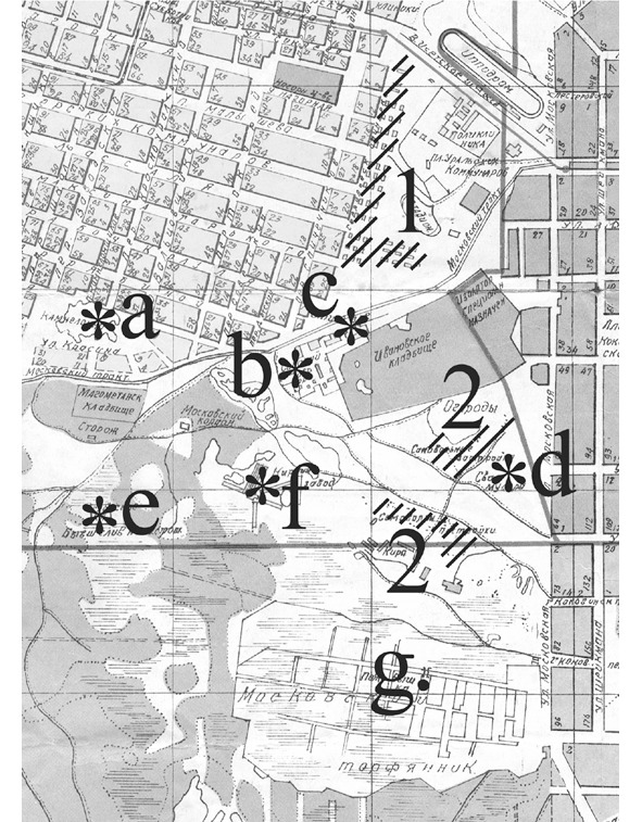 Карта восточной части Молотовского района г. Свердловска. Штриховкой обозначены участки: 1- барачной застройки, непосредственно прилегавшие к Площади Коммунаров, и 2 – самовольной застройки в районе Московского торфяника. Именно в бараках в районе «1» проживал пропавший в сентябре 1939 г. Вова Петров. Использована карта 1932 г., поскольку после 1940 г. бараки в районе площади Коммунаров были в своём большинстве снесены и на их месте возведены больница Верх-Исетского завода, электроподстанция и иные постройки, в силу чего карты последующих лет не позволяют получить представление о наличии и истинном расположении объектов на территории Молотовского района. Знаками «*» и буквами обозначены: «a» – каменоломни к северу от Московского тракта, «b» – собачий двор, куда свозили отловленных на улицах города бродячих собак, «с» – завод по обработке утильсырья, «е» – скотомогильник, территория которого ранее использовалась для слива городских нечистот, «f» – кирпичный завод, «d» – свалка мусора. Точкой». g» обозначена пожарная вышка на Московском торфянике. Что и говорить, район пустынный и мрачный! Приведенная карта особенно интересна для нас тем, что на ней указаны зоны ответственности территориальных отделов Рабоче-крестьянской милиции: 4-го (кварталы слева вверху) и 1-го (по правому краю карты). Граница между ними обозначена сплошной непрерывной линией. Легко заметить, что площадь Коммунаров находится как раз на границе их зон ответственности.
