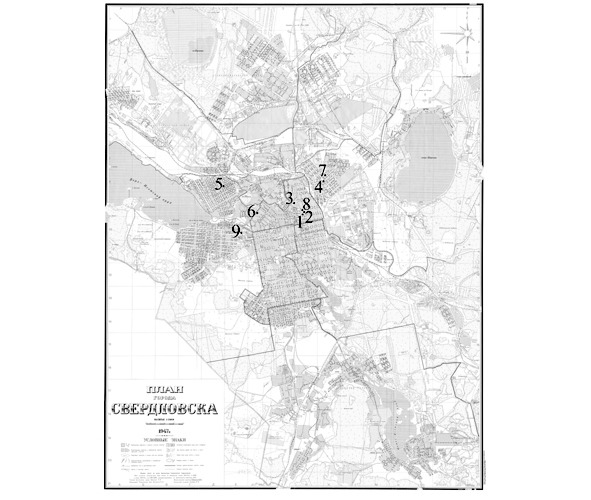 Карта г. Свердловска с указанием мест исчезновения детей в 1938—1939 гг. Точками обозначены места: «1» – похищения 12 июля 1938 г. Герды Грибановой, «2» – попытки похищения 10 февраля 1939 г. Бори Титова, «3» – покушения на убийство 1 мая 1939 г. Раи Рахматуллиной, «4» – похищения 12 июня 1939 г. Али Губиной, «5» – похищения 30 июня 1939 г. Риты Ханьжиной, «6» – похищения 22 июля 1939 г. Вали Камаевой, «7» – похищения 27 июля 1939 г. Лиды Сурниной, «8» – похищения 20 августа 1939 г. Ники Савельева и «9» – исчезновения 12 сентября 1939 г. Вовы Петрова. После похищения в августе в Сталинском районе Ники Савельева преступник вновь вернулся в западную часть города, в район поселка Верх-Исетского завода. Видимо, он регулярно бывал в прилегающих к месту похищения кварталах, вполне вероятно, там жили его родственники, либо ему приходилось там появляться по делам работы или учебы. Во всяком случае, существовала веская причина (возможно, даже не одна!), способная правдоподобно объяснить знакомым и родственникам регулярные появления преступника в западной части города. Примечательно, что активность злоумышленника не распространялась на районы Свердловска к северу и югу от Сталинского. Причин тому могло быть несколько и самая очевидная из них – худшая транспортная доступность северной части города, связанной с центром длинной петляющей трамвайной линией, по которой в 1939 г. был пущен только один маршрут.