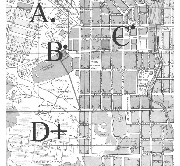 Карта восточной части Молотовского района г. Свердловска, позволяющая составить представление о перемещениях Вовы Петрова после его исчезновения около полудня 12 сентября 1939 г. Использован фрагмент карты 1932 г. как более точно передающей специфику застройки и городской инфраструктуры, нежели карты, датированные после 1940 г. Условные обозначения: «А» – место проживания мальчика в бараке №1 на пл. Коммунаров, возле которого мальчика в 11:20 в последний раз видели мать и братья, в 12:45 именно от этого места начались его розыски; «В» – сквер по ул. Репина, дом №4, в нём около 12 часов Мария Вяткина видела мальчика, в котором узнала Вову Петрова, мальчик был один; «С» – площадь 1905 г., на которой пропавшего мальчика независимо друг от друга около 13 часов или несколько позже видели Михаил Кириллов и Лиза Бухаркина. Свидетели хорошо знали мальчика и исключали ошибку опознания, по их хорошо согласующимся показаниям Вова Петров шёл в обществе крупной женщины в пальто, двигался он в направлении улицы 8-го марта, т.е. удалялся от места проживания; «+D» – место обнаружения трупа Вовы Петрова в районе Московского торфяника Еленой Бурениной и Дарьей Стерлиговой около 17 часов 12 сентября (т.е. спустя 5 или даже менее часов с момента исчезновения ребёнка). Место показано условно, поскольку в официальных документах нет точной привязки к ориентирам на карте, а содержится лишь невнятное указание на местонахождение трупа в районе мыловаренного завода (причём, расстояние до него также не указано). Расстояния от А до С примерно 1,5 км., от В до С – примерно 1,2 км., от А до D – неопределенно, поскольку точное положение D неизвестно, но никак не менее 2 км. по прямой, от С и D – тоже неопределенно в силу означенной причины, но при любых условиях больше расстояния между А и D. Все поименованные точки однозначно связаны с Вовой Петровой и его присутствие в этих местах в указанное время не вызывает сомнения. Однако, при взгляде на карту нельзя не заметить труднообъяснимую разбросанность отмеченных мест. Все они взаимно удалены на значительные расстояния и вызывает большие сомнения возможность маленького мальчика (его возраст, напомним, 3 годика!) самостоятельно такие расстояния преодолевать. Можно допустить, что Вова сам ушёл от дома к скверу у тюрьмы и похищение произошло именно там, а вовсе не возле дома. В этом случае направление движения похитительницы, замеченной на площади 1905 г. свидетелями Кирилловым и Бухаркиной, уводившей ребёнка прочь от места следует признать вполне логичным. Однако, дальнейшее движение похитительницы представляется в высшей степени страннным. Кажется невероятным, чтобы хорошо одетая женщина (притом в обуви на каблуках!) лично повела жертву на торфяник с целью убийства. Кроме того, много вопросов рождает мотивация действий женщины-убийцы. Хотя феномен женщин-детоубийц существует, всё же, совершаемые ими преступления обычно совершенно иного типа, нежели то, что мы видим в данном случае. Использование ножа в качестве орудия убийства также заставляет усомниться в том, что умерщвление осуществлялось женщиной. И хотя присутствие женщины на месте убийства полностью исключать нельзя – след обуви маленького размера вполне мог принадлежать именно ей – всё же, в данном случае чувствуется рука убийцы мужского пола. Однако, это допущение заставляет пр