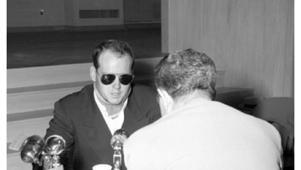 Сэм Шэппард во время дачи показаний после выписки из больницы: шея в корсете (бандаже), тёмные очки скрывают синяки на лице и кровоизлияния в склеры глаз.