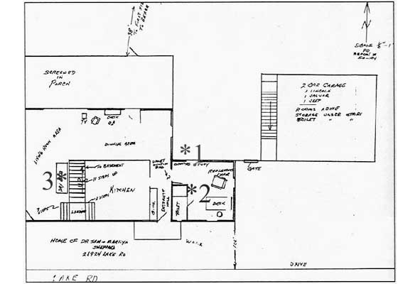 План дома Шэппардов, подготовленный полицией и фигурировавший на суде 1954 г. План составлен с учётом ориентации постройки относительно сторон света. Южнее дома, в самом низу – Лэйк-роад, наверху – озеро Эри, до него примерно 20 метров. Большая L-образная постройка в левой части рисунка – 2-этажный жилой дом, прямоугольная постройка справа – 2-этажный гараж. Знак «*» и цифры «1», «2», «3» нанесены автором очерка. Цифра «1» показывает вход в подвал с улицы; «2» – люк из подвала в полу гостевой комнаты; «3» – тахту, на которой уснул Сэм Шэппард. Окна спален на втором этаже, в которых находились Мэрилин Шэппард и Сэм-младший, выходили в сторону озера, то есть на север. Из этой схемы можно видеть, что человек, открывающий дверь в подвал, не мог быть замечен из окон дома, а также со стороны Лэйк-роад. Злоумышленник мог подняться на второй этаж, пройдя через кухню; в этом случае он вполне мог не заметить спавшего на тахте в гостиной Сэма. Такой маршрут хорошо объясняет то обстоятельство, почему убийца не напал сначала на мужа: он его просто не увидел в тёмном доме. Появление в «деле Шэппарда» прохода через подвал до такой степени не понравилось следователям, что они сделали всё возможное, чтобы скрыть это открытие. Поэтому даже спустя три месяца с момента осмотра подвала во время подготовки обвинительного заключения работники прокуратуры не стали уточнять план дома, представив суду фактически фальсифицированный документ.