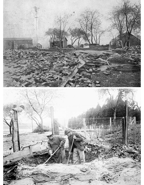 В первых числах мая 1908 года на ферме, принадлежавшей ранее Белль Ганес, работали трое рабочих. За их работой следил помощник шерифа, которому надлежало фиксировать находки, способные пролить свет на причину пожара, уничтожившего жилой дом.