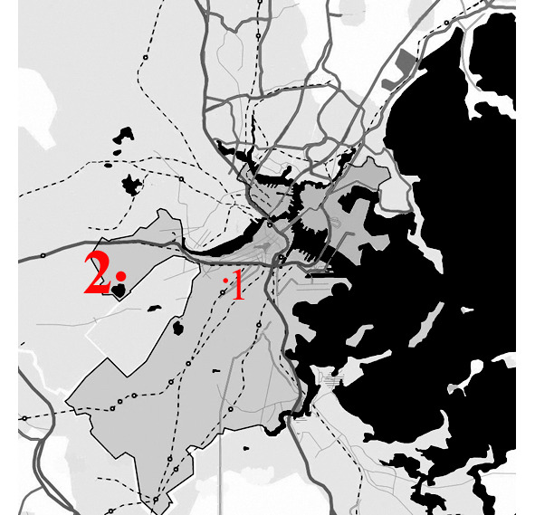 Схема Большого Бостона с указанием мест совершения убийств пожилых женщин посредством удушения летом 1962 г. Цифра 1 обозначает место убийства Анны Слесерс 14 июня, а 2 – Нины Николс 30 июня. Расстояние между точками немногим более 5 км.