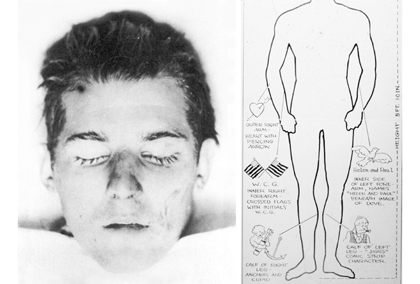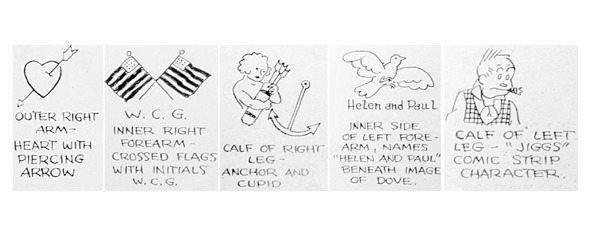 Погибший имел на теле пять татуировок, что и предопределило прозвище, которое ему дали следователи – «Татуированный мужчина». Они изображали: 1) пронзённое стрелой амура сердце (на внешней стороне предплечья правой руки); 2) перекрещенные флаги с инициалами W.C.G. под ними (на внутренней стороне предплечья правой руки); 3) купидона с колчаном стрел и якорем (на икре правой ноги); 4) голубку с подписью «Хелен и Пол» (Helen and Paul) (на внутренней стороне предплечья левой руки); 5) Джиггса, героя популярного комикса «Воспитание отца» («Bringing Up Father»), издававшегося с 1913 года (на икре левой ноги). К нанесению татуировок обычно склонны представители некоторых профессиональных групп: моряки, военнослужащие и преступники. Наличие в числе татуировок изображений якоря и волны наводило на мысль, что погибший мог быть моряком, но в точности это подтвердить не удалось – личность «Татуированного мужчины» так никогда и не была установлена.