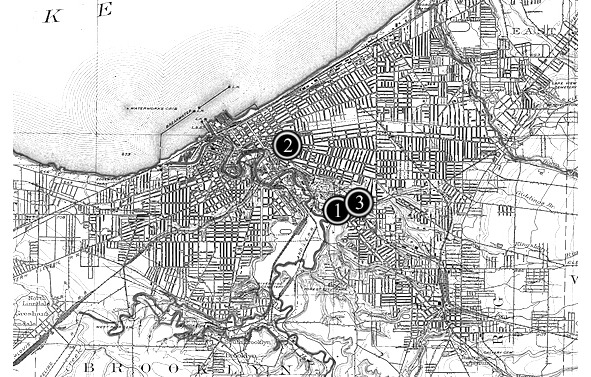 Локализация мест обнаружения расчленённых тел на карте Кливленда. Числа обозначают: 1 – район Джэкасс-хилл, где 23 сентября 1935 года были найдены останки Эндрасси и неизвестного мужчины; 2 – пересечение Сентрал-авеню и 21-й стрит, где 26 января 1936 года были обнаружены фрагменты тела Флоренс Полилло; 3 – место обнаружения «Татуированного мужчины» 5 июня 1936 года.