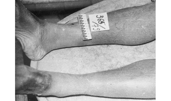 Ступни покойного. Их состояние описано в акте следующими словами: «Кожа на тыле стоп чёрно-синюшная, влажная. Кожа подошвенной поверхности стоп влажная, рыхлая, сморщенная, белесовато-серого цвета».