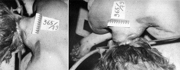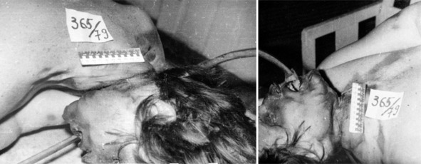 Очень скрупулёзно, как того требовали обстоятельства, судмедэксперты зафиксировали состояние странгуляционного следа. Сам пояс (т.е. петля) был удалён с шеи в процессе судебно-медицинского исследования. Ещё одна необходимая цитата:» (…) с трупом доставлен из такого же материала (что и плащ – прим. А.Р.) кусок ткани длиной 20 см. Ширина петли на шее и на свободном конце разная: от 3 см до 4 см. После снятия петли на шее обнаружена циркуляционная вдавленная странгуляционная борозда, которая расположена: спереди – выше верхнего края щитовидного хряща, сзади – по границе оволосения, на боковых поверхностях шеи слева на 4 см от угла нижней челюсти, справа – на 1 см ниже угла нижней челюсти. Ширина борозды спереди 1 см, на боковых поверхностях справа – 2 см, слева – 1,5 см. Справа, сзади, на границе оволосения борозда расширяется. Поверхность борозды плотная, серо-жёлтого цвета, гладкая. Выражены боковые валики борозды.» Были сделаны качественные фотографии, иллюстрировавшие зафиксированное судмедэкспертами состояние странгуляционной борозды. Некоторые из этих фотографий приведены ниже.