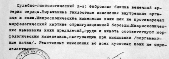 – Причина смерти: механическая асфиксия, обусловленная сдавлением шеи петлёй, затянувшейся под тяжестью собственного веса. Отмечен признак, характерный для данного вида асфиксии – циркулярная (т.е. опоясывающая) косо-восходящая странгуляционная борозда на шее. Констатировано отсутствие другой причины смерти.
