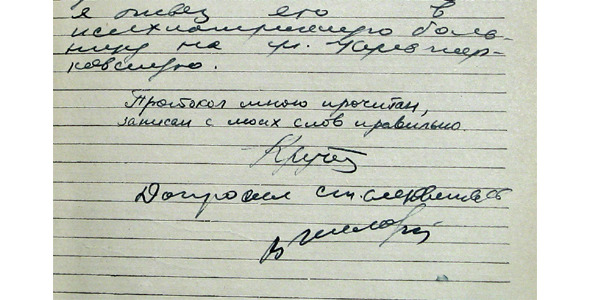 Подпись доктора Кручека Е. М. под протоколом допроса.
