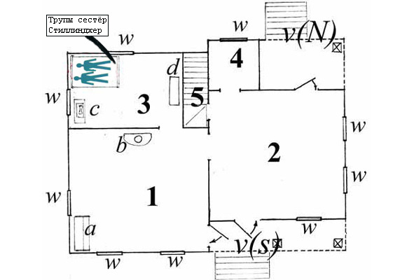 План 1-го этажа дома семьи Мур. План ориентирован по сторонам света (вверху – север, внизу – юг). Показаны входные двери, межкомнатыне – не показаны. Условные обозначения: «w» – окна, «v (S)» – веранда с лестницей на южной стороне дома, «v (N)» – веранда с лестницей на северной стороне дома, «1» – гостиная, «2» – кухня, «3» – спальня, «4» – кладовая, «5» – лестница на 2-й этаж. На плане отображено расположение наиболее крупных предметов мебели: «а» – фортепиано, «b» – металлическая печь с дымоходом, «с» – швейная машинка с тумбой под нею, «d» – комод с постельным бельём. Пиктограммы показывают расположение 2-х детских трупов в кровати в спальне 1-го этажа.