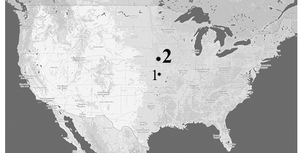 Карта США с указанием мест совершения преступлений «Убийцей топором» в 1912 г. Цифрами обозначены: 1 – г. Паола, штат Канзас, где 5 июня были убиты супруги Хадсон (2 чел.); 2 – г. Виллиска, штат Айова, место убийства в ночь на 10 июня семьи Мур и их гостей сестёр Стиллинджер (8 чел.). Расстояние между Паолой и Виллиской – 260 км. в меридиональном направлении, оба города в начале XX века являлись крупными железнодорожными узлами.