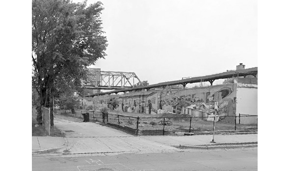 Современная фотография того места, где находился «Замок» Маджета-Холмса. Городской ландшафт за прошедшие 130 лет изменился неузнаваемо: непрерывные прежде улицы оказались разделены промзонами и парками, разбивка на кварталы радикально поменялась, нумерация домов совершенно не соответствует той, что была в конце XIX столетия. Но кое-какие ориентиры остались на своих местах, например железнодорожный мост, который можно видеть на заднем плане как на этой фотографии, так и на фотографии «Замка», представленной в этом очерке выше.