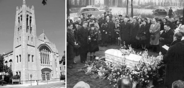 Слева: современная фотография храма Святой Гертруды в Чикаго, в котором отпевали Сюзан. Справа: фотография похорон Сюзан Дегнан 11 января 1946 г.