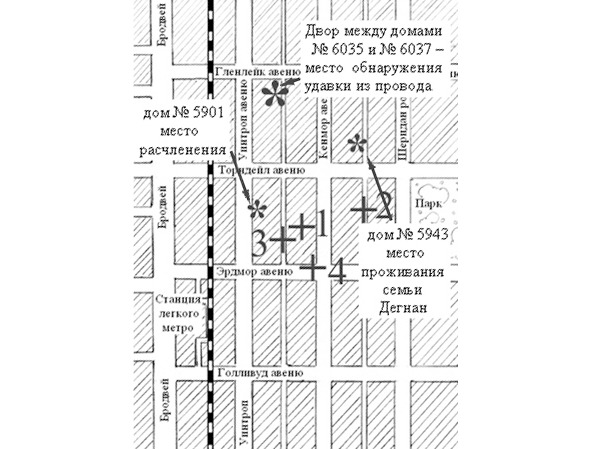 Схема района Эджуотер в городе Чикаго с указанием мест, связанных с расследованием в январе 1946 г. убийства Сюзан Дегнан. Схема условна и содержит ряд искажений, связанных с удобством её отображения, в частности, улицы показаны более широкими, нежели на самом деле. Помимо мест проживания семьи Дегнан и расчленения трупа Сюзан, числами 1—4 показаны места расположения колодцев ливневой канализации, в которых на протяжении ночи с 7 на 8 января 1946 года оказались обнаружены части тела убитой девочки. Большой звёздочкой * к северо-западу от квартиры Дегнан обозначен двор между домами №6035 и №6037 по Уинтроп авеню, в котором 21 января была обнаружена удавка, использованная для умерщвления девочки. В этой связи интересно отметить то обстоятельство, что преступник не ушёл далеко от дома жертвы и избавился от орудия убийства в нескольких сотнях метров от него. Это открытие подтвердило справедливость сделанного ранее вывода об отсутствии у преступника автомашины.