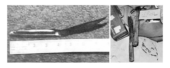 Орудия преступления, найденные в гостиной дома №28. Слева – нож с погнувшимся лезвием, найденный неподалёку от тела Джона Шарпа, справа – нож и молоток, уложенные рядом на столике на выходе из гостиной.