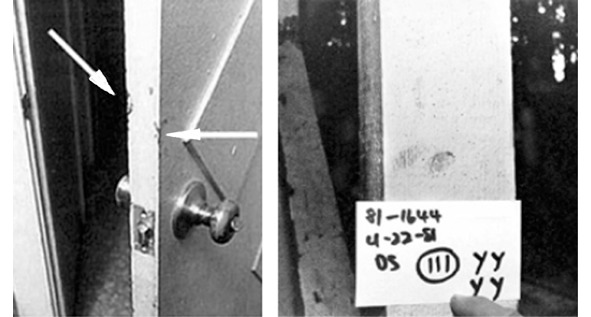 Фотографии отпечатков, оставленных окровавленными пальцами: слева – на двери в «женскую» спальню (отпечатки указаны стрелками), справа – на одной из опор лестницы чёрного хода.