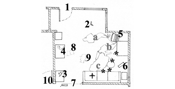План гостиной дома 28 с указанием основных объектов, связанных с групповым убийством, произошедшим там в ночь с 11 на 12 апреля 1981 г. Светло-серым цветом обозначены тела погибших: «а» – Джона Шарпа, «b» – Дэйна Уингейта, «с» – накрытое одеялом тело Гленны «Сью» Шарп. Цифрами чёрного цвета обозначены: «1» – входная дверь с южной стороны; «2» – погнутый нож, использованный для пытки Джона Шарпа со следами его крови; «3» – окровавленные молоток и разделочный нож, оставленные на столике при выходе из гостиной. Там же лежала голубая окровавленная рубашка, принадлежавшая Тине Шарп; «4» – телефон со снятой трубкой на белой тумбочке, обильно испачканной размазанными следами крови; «5» – телевизор на подвижной этажерке. Согласно показаниям выживших детей, вечером 11 апреля телевизор находился не там, где его обнаружили после преступления; «6» – магнитола «Sanyo», снятая со своего места на тумбочке возле дивана и поставленная с неизвестной целью на пол; «7» – кусок телефонного провода, отрезанный в «женской» спальне и брошенный в проёме между кухней и гостиной. Длина провода в точности неизвестна, но по фотографиям её можно оценить в пределах от 5,3 м до 7,5 м; «8» – журнал и школьная тетрадь Тины Шарп, брошенные на пол возле тумбочки с телефоном; «9» – куртка от спортивного костюма Джона Шарпа, в который он был одет в ночь убийства; «10» – дверь в «мальчишескую» спальню. Условными знаками обозначены: «*» – две пары обуви, принадлежавшие Гленне и Тине Шарп; "+" – початая пачка сигарет «Camel», которые курила Гленна «Сью» Шарп, найденная на месте снятой с дивана подушки. Розовые брюки от женского брючного костюма, скомканные и задвинутые под диван, на схеме не обозначены, дабы не загромождать рисунок.