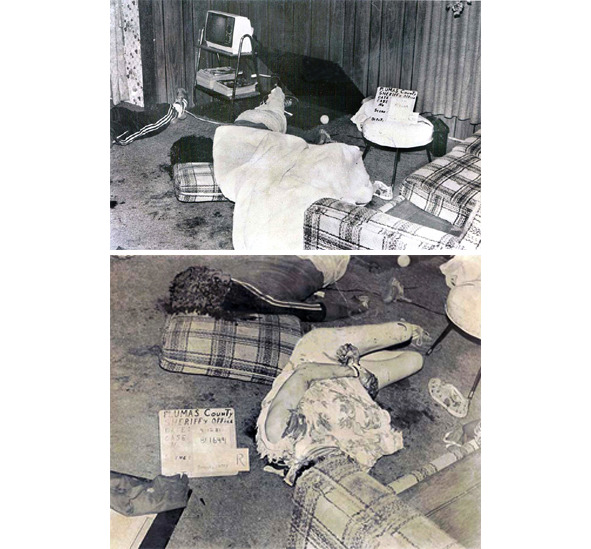 Расположение тел убитых в гостиной дома №28 до и после удаления одеяла, скрывавшего труп Гленны «Сью» Шарп. На верхней фотографии видны ноги Джона Шарпа, его друг Дэйн Уингейт лежит головою на диванной подушке. Хорошо заметен электрический провод в белой изоляции, которым были связаны ноги юношей.