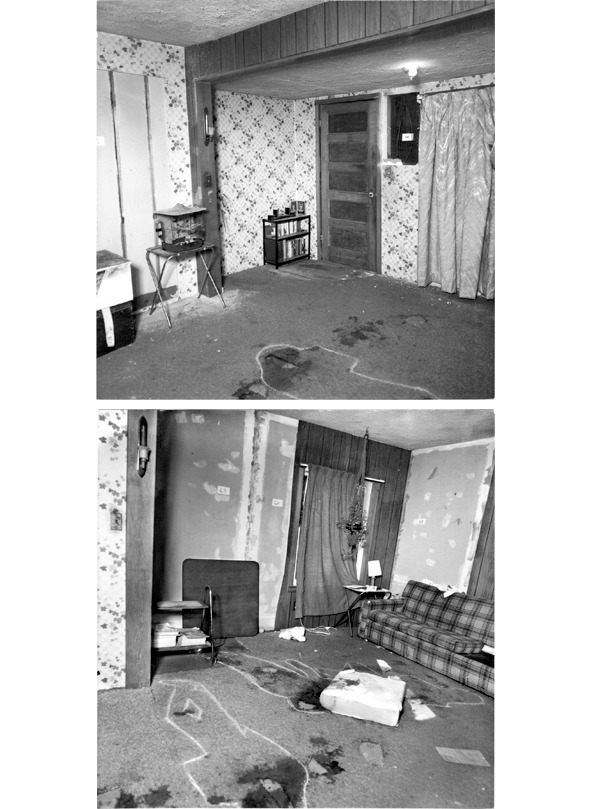 Фотографии гостиной, явившейся местом преступления, позволяют получить представление о размерах комнаты, состоянии жилища и весьма невысоком уровне его комфорта. Снимки сделаны после выноса тел убитых, их позы и места нахождения обозначены меловыми контурами. Фотография слева: вид от дивана в направлении входной двери. Фотография справа: вид от входной двери в сторону дивана.