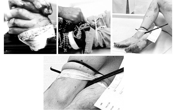 Детальные фотографии, демонстрирующие способы связывания погибших. На крайнем левом фотоснимке – руки Джона Шарпа в «положении молящегося», с замотанными липкой лентой запястьями. Две центральные фотографии показывают способ связывания Гленны Шарп по схеме «обе руки – обе ноги». Хорошо видны ступни женщины, сильно запачканные чужой кровью, что наводит на мысль о её свободном перемещении уже после убийства подростков, или, по крайней мере, одного из подростков. Также хорошо видна размазанная кровь на коленях Гленны и отдельные кровавые капли на икрах. Как показало судебно-медицинское исследование, эта кровь не принадлежала Гленне Шарп. На крайнем правом снимке можно видеть, как были связаны ноги Дэйна Уингейта.