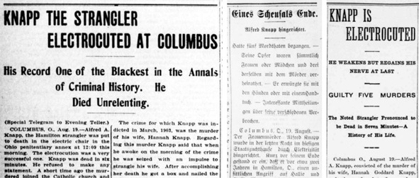 Публикации в американской прессе, посвящённые казни Альфреда Кнаппа. В центре – заметка в немецкоязычной газете. Казнь убийцы была встречена без ажиотажа, но с одобрением и даже удовлетворением от произошедшего.