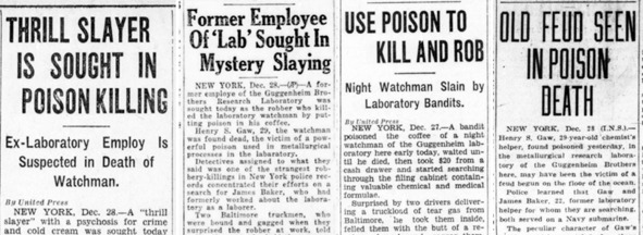 В конце декабря 1928 г. местные газеты сообщили о странном преступлении на химической фабрике Дэниела Гуггенхайма. Использование яда для убийства и ограбления представлялось весьма экстравагантным, особенно учитывая то, что преступник – когда ему это понадобилось – без проблем в одиночку подавил сопротивление двух крепких мужчин. То есть это явно был человек не робкого десятка и уверенный в своих силах. Но зачем такому бойцу пользоваться цианистым калием?