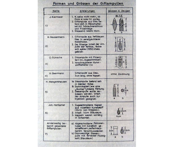 Страница из описания различных типов ампул с цианистым водородом, использовавшихся фашистами. В конце Второй Мировой войны по заданию руководства Третьего рейха было разработано несколько типов ампул с синильной кислотой [цианистым водородом]. Ампулы эти в зависимости от конструкции предназначались для скрытого крепления в деталях одежды [в воротнике или рукаве], ношения в специальном футляре или же размещения во рту. Гиммлер именно во рту скрыл свою ампулу, которая осталась незамеченной конвоем при двух первых обысках.