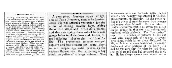 Около 00:30 21 сентября Джесси Померой признал, что был тем самым «Мучителем детей», что совершал нападения сначала на холме Поудер Хорн на окраине Челси, а затем в Южном Бостоне. Он сообщил некоторые детали совершённых преступлений, впрочем не очень много, учитывая большое количество преступных эпизодов и множество неясных пока подробностей. На вопрос о причине нападений Джесси лаконично ответил, что не может этого объяснить. Он и в последующем на вопросы о причине своей агрессии в отношении мальчиков отвечал предельно общо: «Меня словно бы что-то толкнуло это сделать»… «Я почувствовал, что могу это сделать» и тому подобное. Любые попытки добиться развёрнутого ответа оказывались безуспешны, Джесси Померой только хлопал глазами и молчал – такая манера поведения, кстати, оказалась очень для него выгодной, потому что незнакомым людям он казался мальчиком откровенно туповатым. А подобное суждение было совершенно неверно, и в своём месте мы ещё скажем об этом несколько слов.