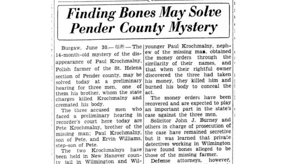 Одна из первых более или менее подробных статей о расследовании исчезновения Пола Крохмального-старшего в номере от 1 июля 1937 года в газете «The daily independent». Заголовок гласит: «Тайна найденных в округе Пендер костей может быть решена».