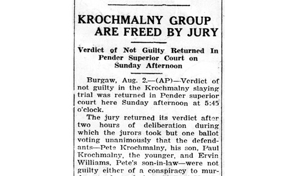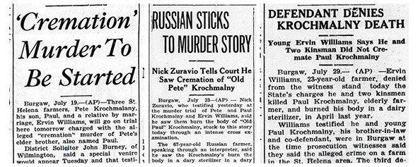 Газетное сообщение о сенсационном завершении судебного процесса по обвинению Эрвина Уильямса, Пита и Пола-младшего Крохмальных в убийстве и сожжении тела Пола Крохмального-старшего.
