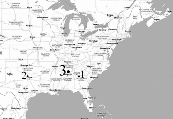 Карта восточных и южных штатов США с указанием мест совершения «семейных убийств» с использованием топора в начале XX века. Цифрами обозначены: 1 – место убийства супругов Харт 4 марта 1908 г. в местечке Фрейзер, штат Джорджия; 2 – место убийства 12 апреля 1908 г. семьи Геррелл в г. Уотога, штат Техас; 3 – место убийства семьи Эдмондсон в районе Вудланд Миллс, штат Алабама.