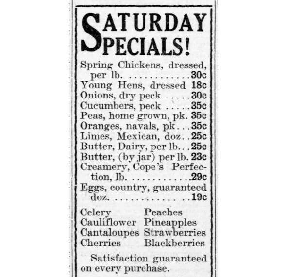 Рекламное объявление из газеты 1910 г. помогает получить представление о ценах на продукты питания в крупных продуктовых магазинах по субботам. Почему по субботам? Ну, потому что суббота – это день семейных закупок. Фунт местного гороха (~450 гр.) стоил 35 центов, мексиканские лаймы – 25 центов, масло в банке – 23 цента за фунт, а развесное – 25 центов. Огурцы шли в одну цену с апельсинами – по 35 центов за фунт. Дюжина яиц стоила 19 центов, а неощипанные цыплята продавались по 30 центов за фунт. Простейший подсчёт показывает, что на 7—8$ в неделю семья из 4 человек могла питаться не только полноценно с точки зрения физиологического поддержания жизни, но и разнообразно.