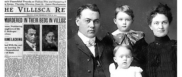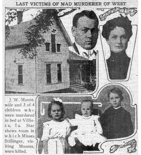 Одна из газет с фотографиями убитых в Виллиске членов семьи Мур. Заголовок гласит: "Последние жертвы сумасшедшего убийцы с Запада [страны]". Случившееся в Виллиске газетчики быстро связали с аналогичными преступлениями, произошедшими в 1911 г. О более ранних событиях никто не думал, точнее, не помнил, но то, что убийца приехал в Айову из Орегона, многими репортёрами и обывателями под сомнение не ставилось.