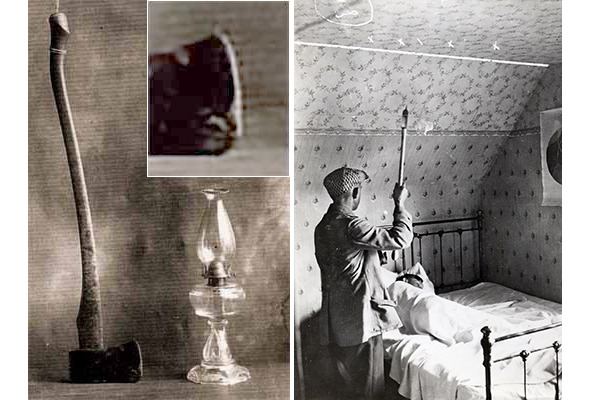 Слева: топор-колун и керосиновая лампа, привлёкшие внимание правоохранителей при осмотре дома семьи Мур. На врезке видно, что угол лезвия топора отколот. Справа: снимок, сделанный в 1917 г. в доме Муров возле той самой кровати, в которой были найдены тела Джозии и Сары, был призван проиллюстрировать тезис, согласно которому убийца имел высокий рост. Дескать, именно ввиду его высокого роста топор задевал лезвием потолок над кроватью. На самом деле эта фотография ничего не доказывает, поскольку человек с топором замаха не делает и даже топор держит неправильно.