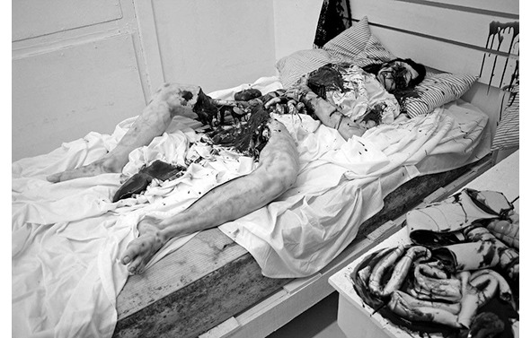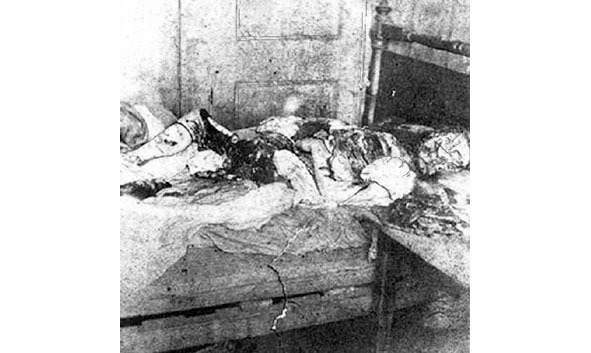 Современная реконструкция того, что было обнаружено в комнате Мэри Келли. Сначала была сделана фотография человека в кровати в схожей позе, после чего снимок был обработан программой «photoshop». На фотографии добавлены детали, известные по дошедшим до нас описаниям очевидцев. Эта фотография позволяет получить представление того, насколько же ужасно выглядело место преступления.