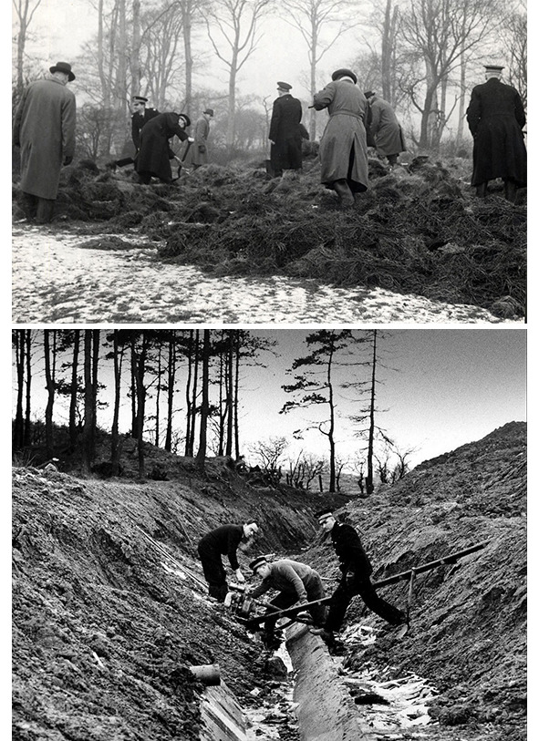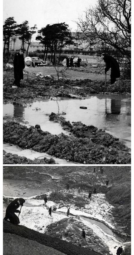 Осмотр местности в районе гольф-клуба в Ист-Килбрайде проводился в светлое время 5 и 6 января с привлечением всех свободных сил полиции Глазго. На фотографии справа можно видеть дренажную траншею по краю территории гольф-клуба – убитая девушка бежала вдоль этой траншеи на протяжении более чем 300 метров.