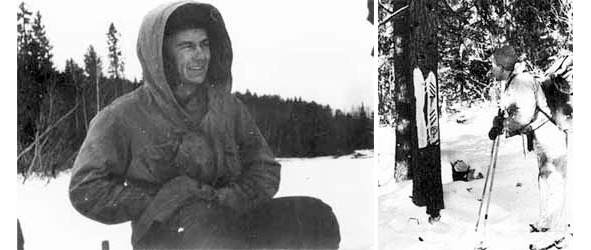 Фотографии из последнего похода группы Дятлова. Левый фотоснимок: Юрий Дорошенко на привале. Фотография справа: Георгий Кривонищенко рассматривает знаки мансийских охотников. Дятловцы в долине реки Ауспия некоторое время шли по следам охотника-манси и образы исконных жителей Урала, видимо, немало занимали воображение туристов. В походном дневнике Зины Колмогоровой остались русские транскрипции нескольких мансийских слов и выражений, а Георгий Кривонищенко сфотографировался рядом с мансийскими «рунами». Никакого глубокого смысла в этой надписи, вообще-то, не было, она гласит, что тут прошли три манси-охотника с тремя собаками и указана родовая принадлежность первых.