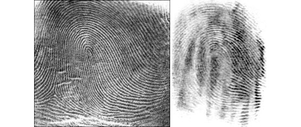 Слева: отпечаток мизинца Уилльяма Хейренса, зафиксированный на его дактокарте в день ареста в июне 1946 г. Справа: отпечаток предположительно того же пальца на листе бумаги с требованием выкупа в 20 тыс.$ за похищенную Сюзан Дегнан.