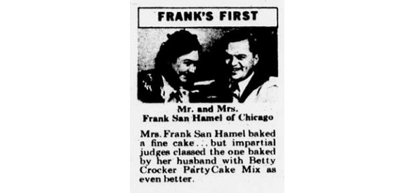 Фотография из газеты 1949 года: Фрэнк Сэн Хеймел вместе с женой в рекламируют печенье. Почему криминальный фотокор занимается таким непотребным делом понять невозможно…
