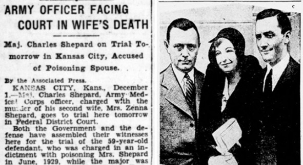 Слева: газетная заметка от 1 декабря 1930 г. о начале суда над майором Шепардом по обвинению его в убийстве жены посредством отравления. Справа: свидетели обвинения – братья МакКоски Куртис (слева) и Теодор (справа), между ними стоит жена Теодора.