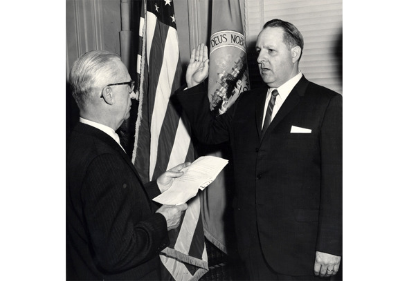 Эдмунд МакНамара присягает при вступлении в должность Начальника Департамента полиции Бостона. Фотография сделана 6 апреля 1962 г.