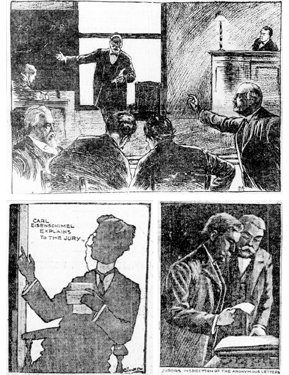 Далее началось очень интересное представление, которое можно условно назвать оглашением [или предъявлением суду] графологических экспертиз. Некоторые моменты этого действа оказались по-настоящему забавны. 20 декабря выступил эксперт штата Эймс, а на следующий день свидетельское место занял Карл Эйзензехиммель. Адвокат Найт, остававшийся совершенно индифферентным при выступлении Эймса, необычайно оживился при появлении Эйзензехиммеля, в последующие два часа он буквально вытряс из него душу, уж простите автора за просторечный слог!