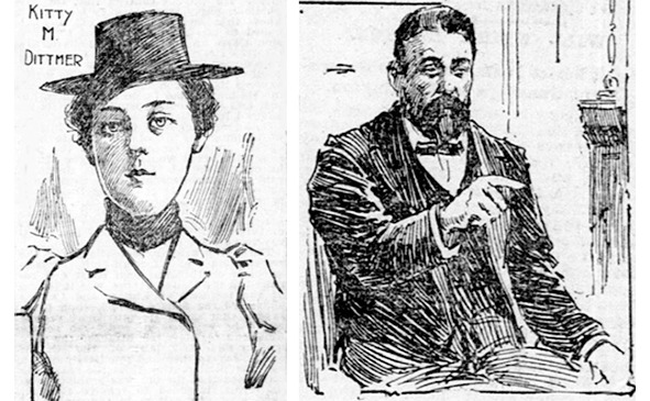 Слева: Китти Диттнер, продавщика кондитерского магазина из Сан-Франциско, продавшая или якобы продавшая конфеты Корделии Боткин. Именно эти конфеты были, по мнению следствия, впоследствии отравлены подсудимой. Справа: Джеймс Бирд, в прошлом свойственник Китти Диттнер, дал этой свидетельнице резко негативную характеристику и попытался предупредить полицию о крайней лживости и ненадёжности её россказней.