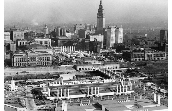 Вид на «Грейт лэйк ЭКСПО» с высоты птичьего полёта. Открытие выставки стало событием федерального уровня и президент США Рузвельт 14 августа 1937 года прибыл в Кливленд для того, чтобы лично осмотреть экспозицию. На заднем плане у левого края фотографии можно видеть здание городской администрации («Сити – холл»), а высотное здание вдали – это «Терминал-тауэр», небоскрёб, являвшийся некоторое время вторым в мире по высоте.