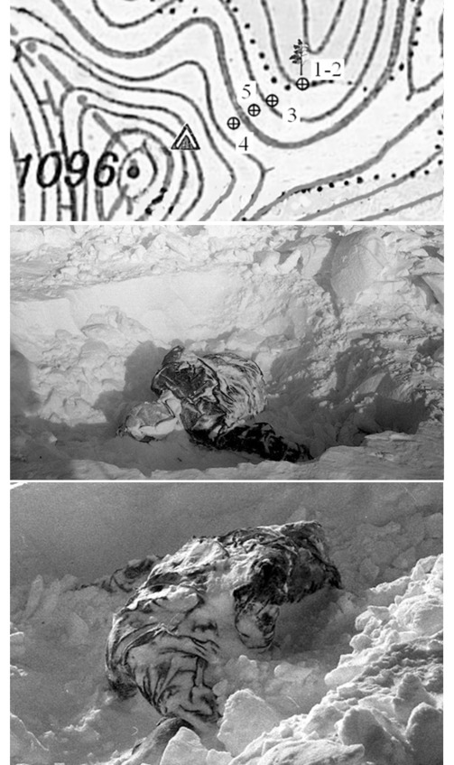 Вверху: схема, демонстрирующая взаимное расположение тел погибших туристов, найденных в феврале-марте 1959 г. Условные обозначения: "^" – палатка группы Дятлова на восточном склоне Холат-Сяхыл, «L» – кедр над четвёртым притоком Лозьвы, "+1—2» – место обнаружения трупов Георгия Кривонищенко и Юрия Дорошенко, "+3» – положение трупа Игоря Дятлова (примерно в 400 м. от кедра), "+4» – положение тела Зины Колмогоровой на склоне Холат-Сяхыл (по приблизительной оценке прокурора В.И.Темпалова примерно в 500 м. от тела Дятлова), "+5» – место, где был найден труп Рустема Слободина. Ниже: фотографии, сделанные на месте обнаружения трупа Рустема Слободина.